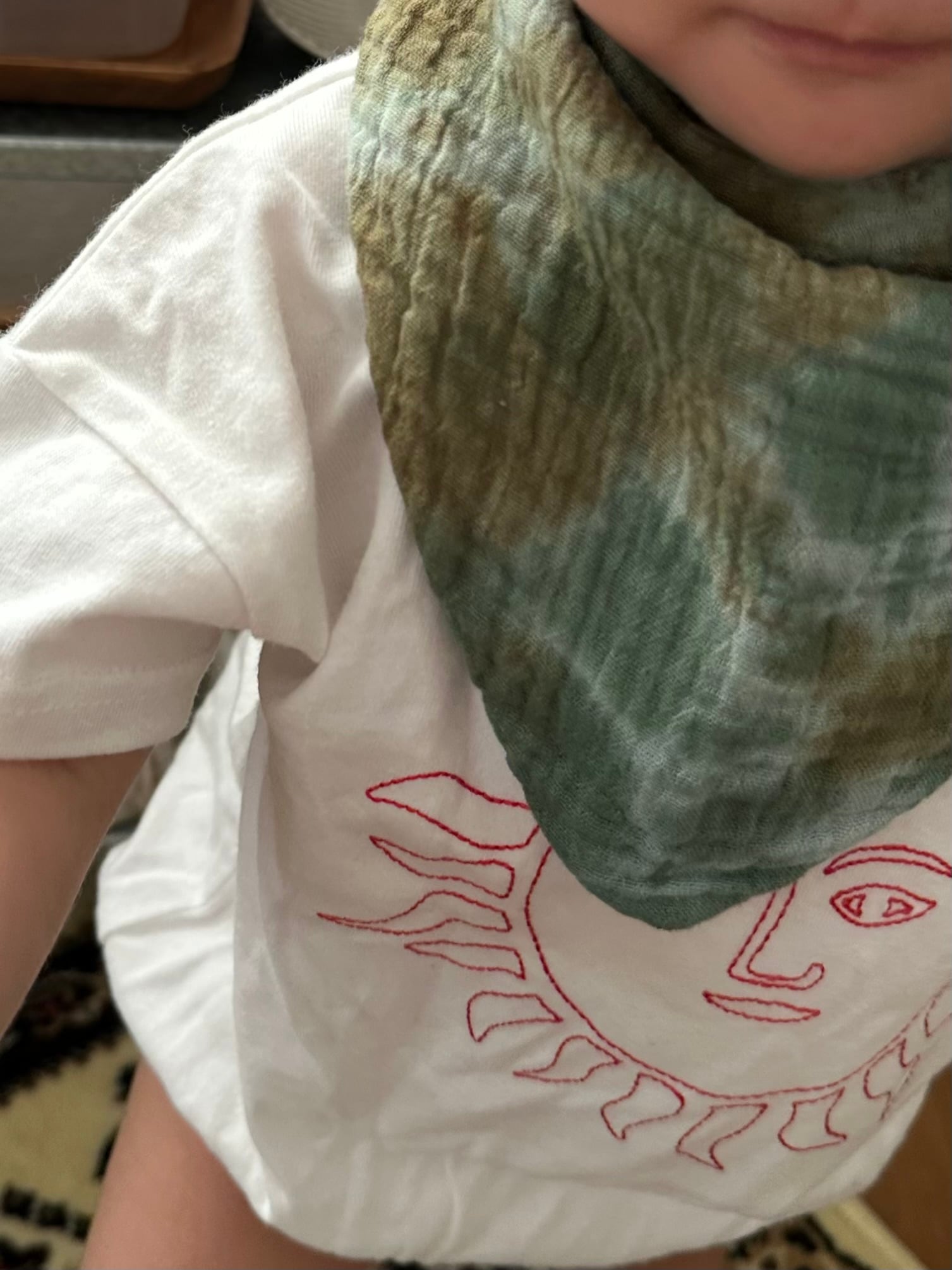 こちらのスタイは独自の手染め技術を用いて、自然なグラデーションと豊かな色合いを表現したアイテムです。シンプルな装いのワンポイントになってくれます。コットン100%の柔らかな素材なので、お子様の肌にも優しく、おしゃれでありながら着け心地も快適なデザインが魅力です。